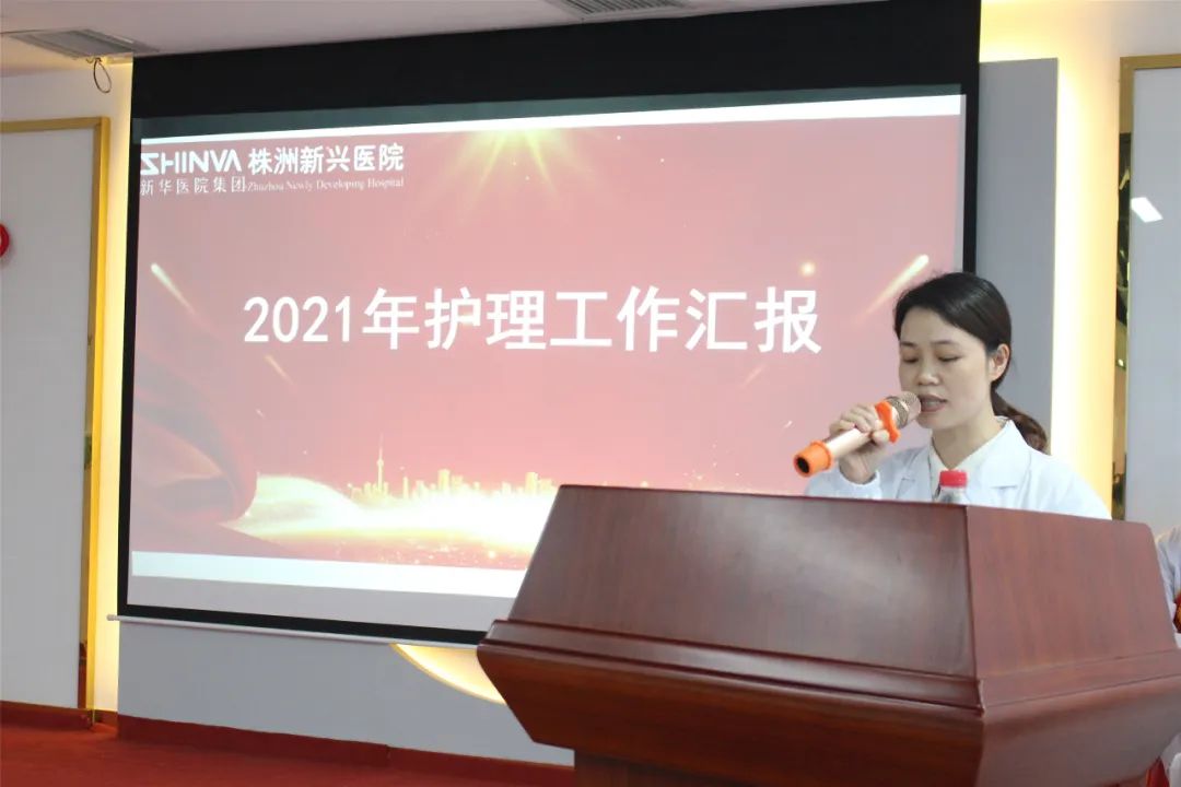 护理部主任邓美秀发表讲话,她总结回顾了2021年我院护理工作开展情况及取得的成绩。一年来,我院护理管理扎实推进,不断完善护士培训机制,不断提高护理质量,全院护理工作人员充分发挥团队协作精神,克服种种困难,面对严峻的疫情,全院护理工作者,白衣执甲、不畏艰难,圆满地完成了全院护理工作,顺利地完成了院党委交办的各项任务。